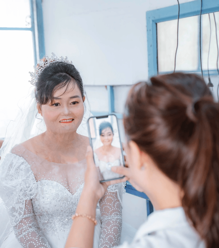 Trên trang cá nhân, chị Ngân diện lên mình bộ váy cô dâu trắng muốt, không giấu được niềm vui sướng lớn lao. Trên cơ thể từng bị tổn thương đến 92% còn nhiều vết sẹo chưa phai, chị nở nụ cười rạng rỡ, tự biến mình thành cô dâu hạnh phúc nhất. Chị nói: "Những người bị tổn thương giống mình cũng tổ chức đám cưới như thường nhưng có thể người ta không dám mặc lên mình chiếc váy cưới một cách tự tin như mình hiện tại đâu".