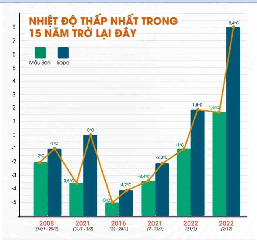 Theo thống kê của VTC News, trong gần 15 năm trở lại đây, miền Bắc nước ta từng có những đợt rét khắc nghiệt, nhiệt độ ở các vùng núi cao giảm xuống dưới 0 độ C. Trong đó, Sa Pa (Lào Cai) và Mẫu Sơn (Lạng Sơn) là những nơi ghi nhận mức nhiệt thấp nhất.