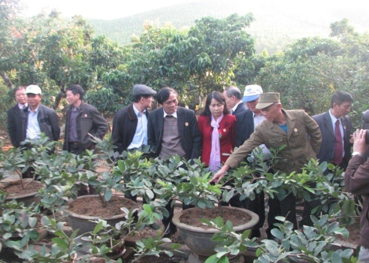 CCB Lê Mạnh Đới (người chỉ tay) giới thiệu mô hình trang trại ổi Đài Loan với Đoàn cán bộ Hội CCB tỉnh Quảng Ninh