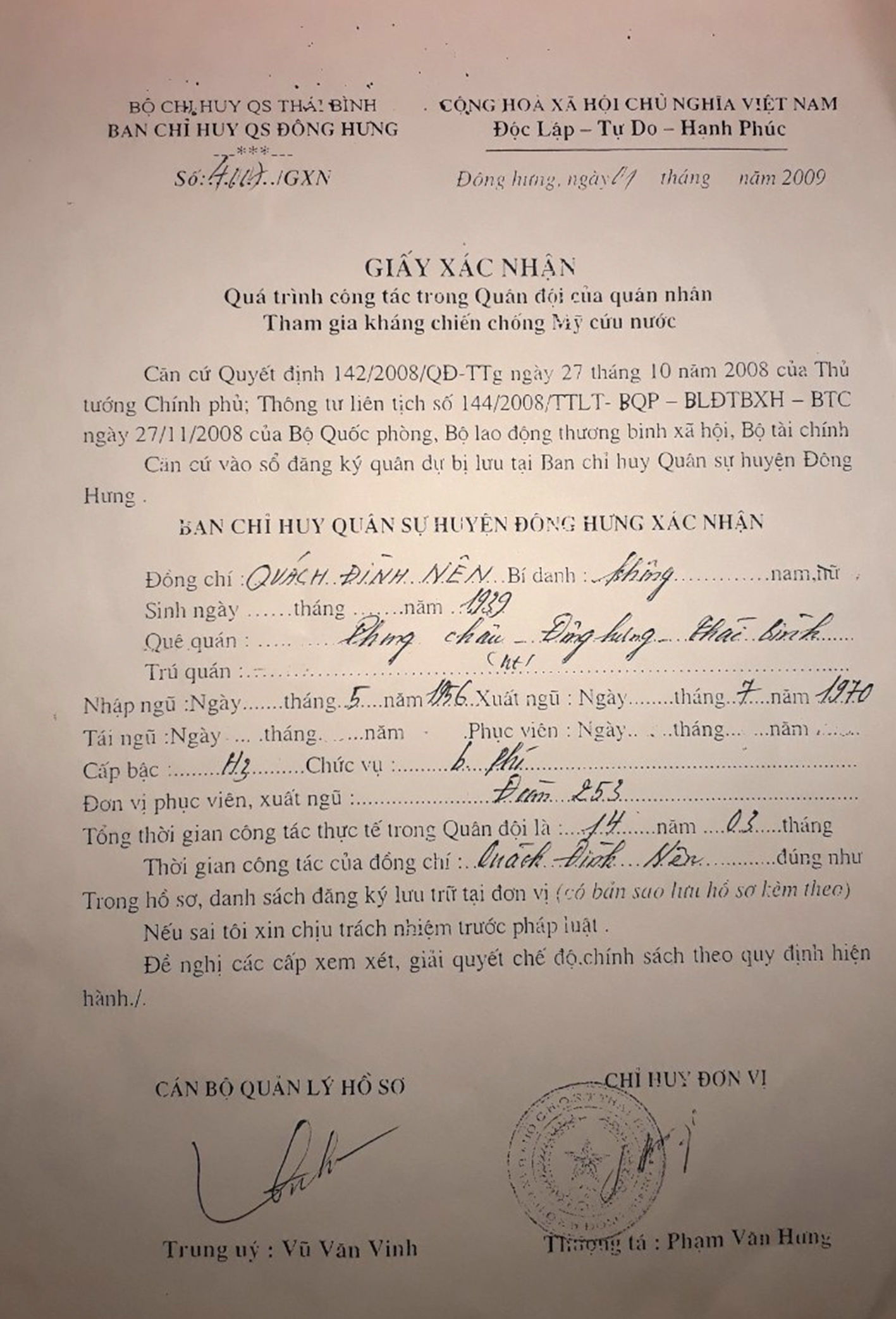 Rất mong được các đơn vị Quân đội quan tâm, kiểm tra, xem xét, giúp đỡ và cung cấp các giấy tờ liên quan đến ông Quách Đình Nên, để có cơ sở đề nghị giải quyết chế độ cho các con, cháu của ông hiện đều bị bệnh nặng, hoàn cảnh gia đình vô cùng khó khăn.