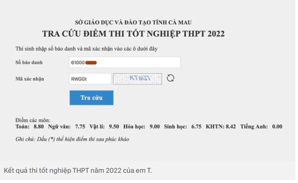 Kết quả thi tốt nghiệp THPT năm 2022 của em T.