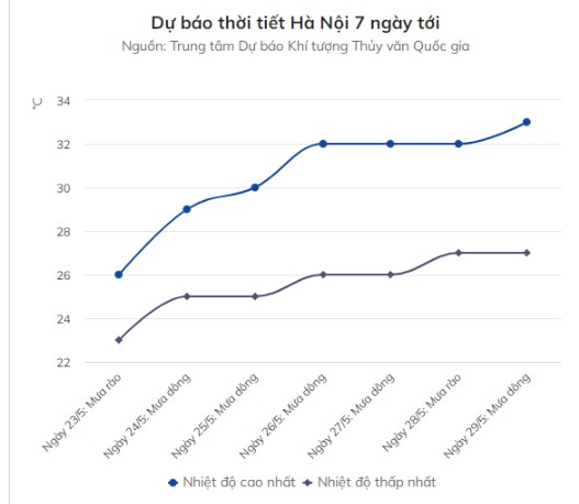 Trong khi đó, Tây Nguyên và Nam Bộ duy trì kiểu thời tiết oi nóng vào ban ngày, mưa dông về chiều và tối liên tục các ngày 23-29/5. Người dân đề phòng những cơn mưa lớn bất chợt kèm nguy cơ lốc, sét, mưa đá và gió giật mạnh.Tại Hà Nội, thời tiết tuần này diễn biến xấu khi mưa dông kéo dài, gần như không ngày nào có nắng. Nền nhiệt tại thủ đô nhích dần lên ngưỡng 29-30 độ C vào giữa tuần, tăng khoảng 3-5 độ C so với những ngày qua nhưng cảm giác vẫn chưa quá oi nóng.