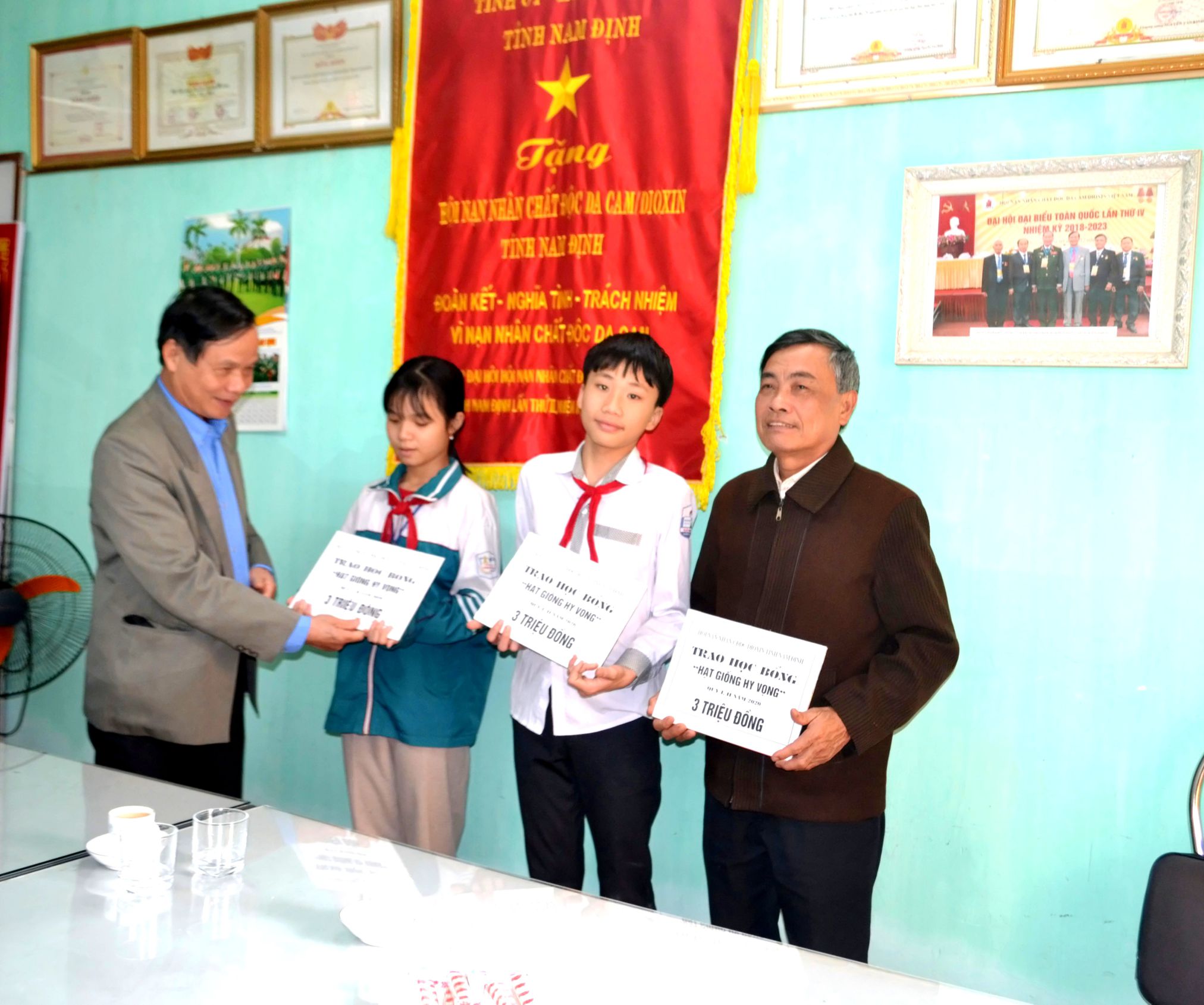 Năm 2019, Hội NNCĐDC/dioxin tỉnh Nam Định đã tổ chức trao học bổng cho 27 cháu là con, cháu NNCĐDC, với số tiền 47 triệu đồng từ nguồn tài trợ của các tổ chức xã hội và các nhà tài trợ đã tiếp sức cho con, cháu NNCĐDC có hoàn cảnh gia đình khó khăn, vượt khó vươn lên học giỏi. Ngày 20/02/2020, tại trụ sở Hội NNCĐDC/dioxin tỉnh đã trao học bổng “Hạt giống hy vọng” cho cháu Phạm Hồng Phú – Học sinh lớp 7A trường, THCS Xuân Kiên, huyện Xuân Trường, cháu Phạm Thị Ngọc Linh – Học sinh lớp 8A trường THCS Hoàng Văn Thụ, TP Nam Định, cháu Mai Thị Diễm Quỳnh – Học sinh lớp 7E trường THCS Hải Xuân, huyện Hải Hậu. Mỗi suất học bổng trị giá 3 triệu đồng do bà MasaKosakata (Nhật Bản) tài trợ, đây là tấm lòng nhân hậu của Bà đối với NNCĐDC Việt Nam nói chung, tỉnh Nam Định nói riêng, là nguồn động viên kịp thời nhất đối với các cháu, động viên và tạo điều kiện để các cháu vượt khó vươn lên trong học tập. Tại buổi trao học bổng, ông Phạm Ngọc Kiểm – Chủ tịch Tỉnh hội đã trân trọng cảm ơn sự quan tâm của Trung ương Hội và nhà tài trợ, động viên, căn dặn các cháu chăm ngoan, học giỏi hơn nữa để đáp lại sự kỳ vọng của gia đình và xã hội, xứng đáng là chủ nhân tương lai của đất nước, là “Hạt giống hy vọng” tươi sáng của ngày mai./.