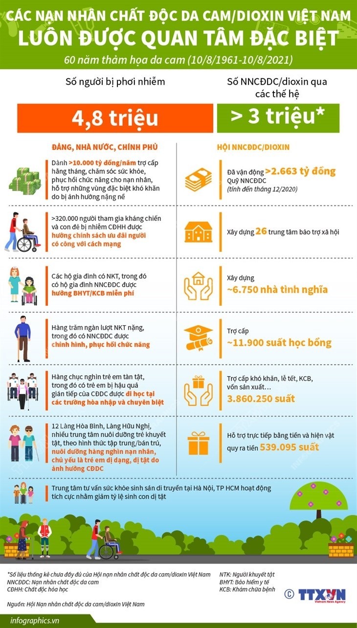 Chất độc da cam đã để lại hậu quả rất nặng nề. Từ lâu, Đảng và Nhà nước luôn quan tâm sâu sắc đến vấn đề chất độc da cam/dioxin và có những chính sách nhằm xoa dịu nỗi đau của cộng đồng./.