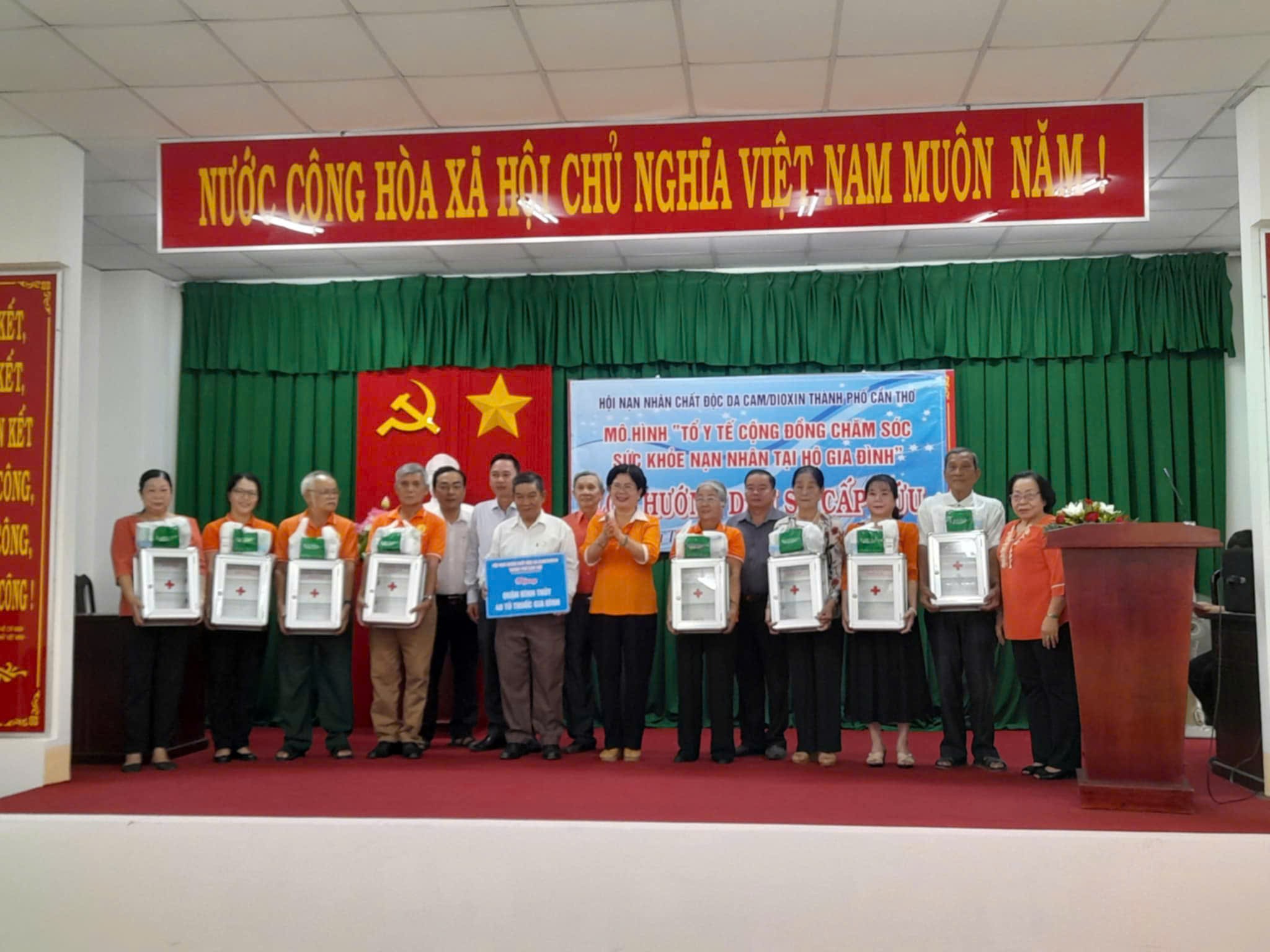 Bà Võ Thị Thanh Nga, Chủ tịch Thành hội cùng lãnh đạo địa phương trao tủ thuốc y tế cho các gia đình NNCĐDC quận Bình Thủy