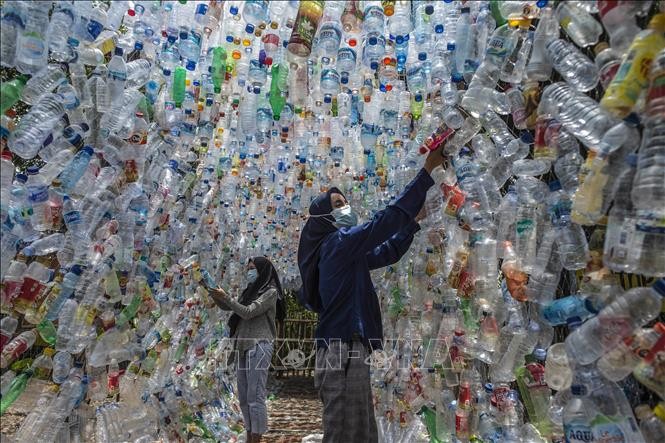 Các nhà bảo vệ môi trường lắp ráp các loại rác thải nhựa làm viện bảo tàng tại Gresik ở phía Đông đảo Java của Indonesia.