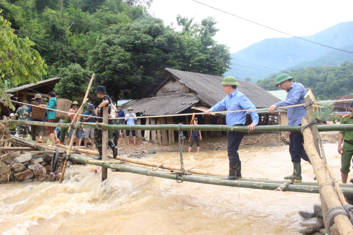 | Chủ tịch UBND tỉnh Nghệ An, Bí thư Huyện ủy Kỳ Sơn cùng đoàn công tác qua cầu tạm đến với dân |