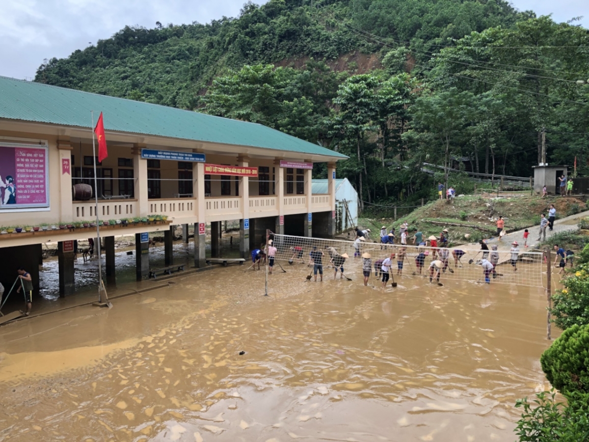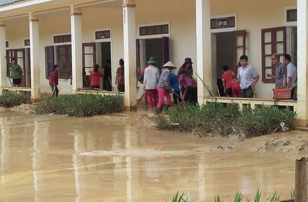 | Người dân giúp các trường vệ sinh môi trường khi lũ tạm rút |