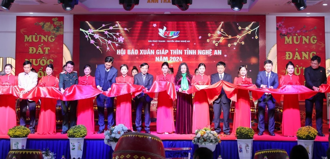 Các đại biểu tham gia cắt băng khai mạc Hội báo xuân Nghệ An