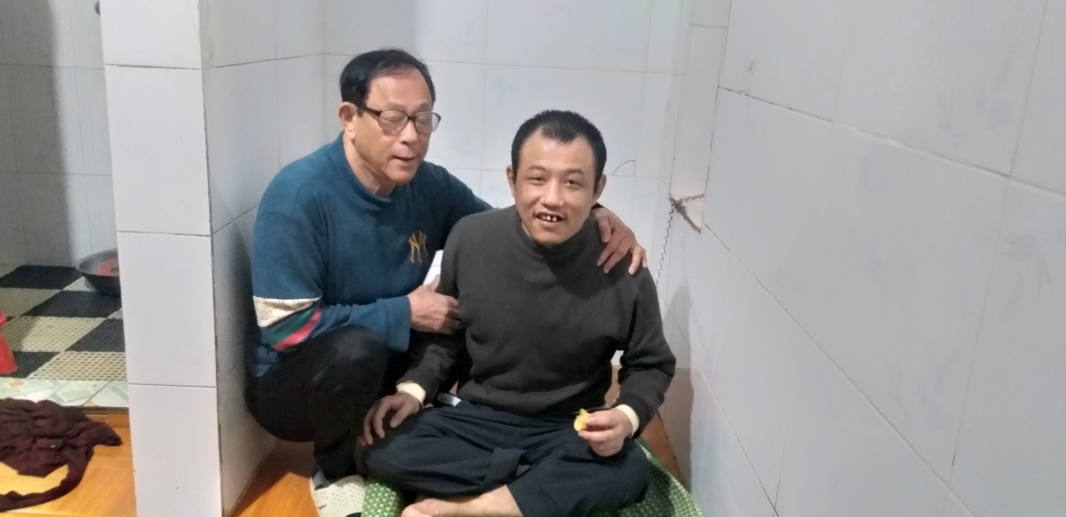 Ông Nguyễn Khánh Nhã, bên người con là Nguyễn Khánh Sơn, sinh năm 1983, phải chịu xích để khỏi quậy phá |