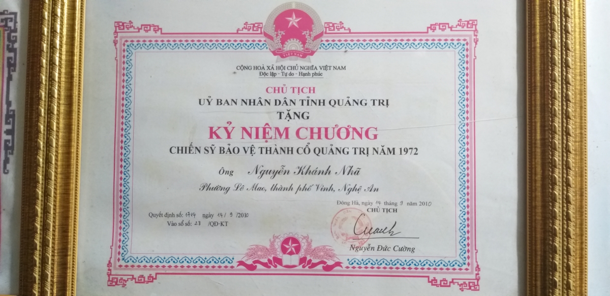 Tại Khối Tân Vinh, phường Lê Mao, thành phố Vinh, có gia đình ông Nguyễn Khánh Nhã, sinh năm 1950, từng chiến đấu ở chiến trường Quảng Trị, sau tham gia chiến dịch Hồ Chí Minh. Năm 1978 phục viên về địa phương, ông xây dựng gia đình và sinh con. Năm 1979, bản thân đau ốm, đi khám mới phát hiện bị nhiễm chất độc hóa học, hiện ông bị các bệnh hiểm nghèo như: Tiểu đường, tim mạch, tai biến, mắt đục 2 tinh thể. Vợ chồng ông sinh được 4 người con, 3 người có gia đình, riêng đứa con út của ông là Nguyễn Khánh Sơn, sinh năm 1983 bị bại não nằm một chỗ, những lúc nó tỉnh táo thì la hét phá phách nên phải xích. Trên tường nhà ông treo trang trọng lịch uống thuốc cho cả gia đình, chứ không phải thời khóa biểu học sinh, vì cả 3 đứa con ông đều nhiễm chất độc hóa học; ông có 7 cháu thì 3 đứa bị di chứng chất độc da cam, biểu hiện rõ là 2 cháu nội, 1 cháu ngoại đều bị ngọng, đi học nói cô không hiểu gì hết.