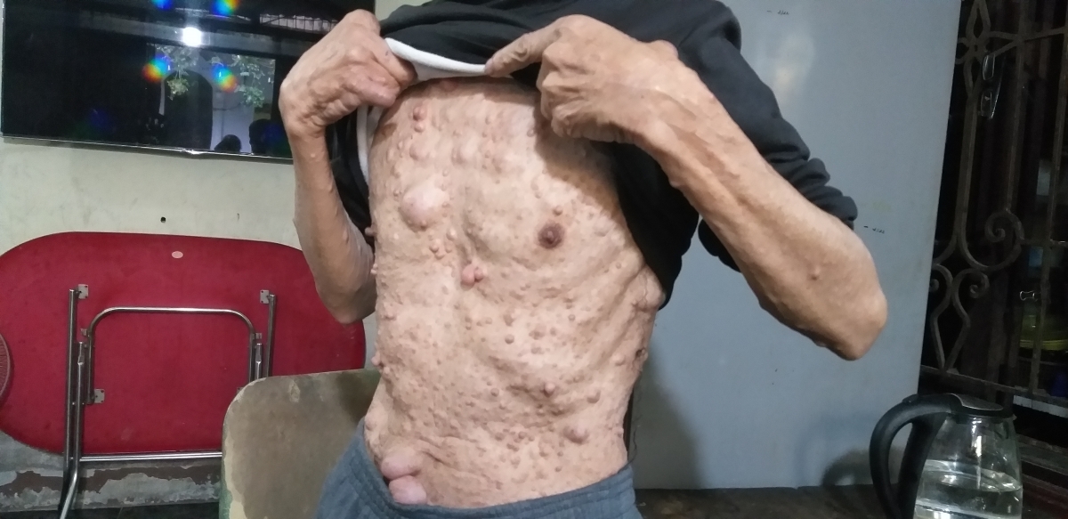 Quan sát trên người ông Hoàng Thanh Tao, thấy nổi u cục khắp người, kể cả trên mặt, cổ, ông còn vạch áo cho mọi người xem, toàn thân không còn chỗ da lành. “Khi vợ sinh được 3 người con, tôi theo dõi thấy sự bất thường của chúng nhưng không dám kiểm tra xem chúng có bị nhiễm chất độc hóa học không, vì nếu chứng minh chúng bị nhiễm thì chắc chẳng ai dám xây dựng gia đình với chúng”. Ông Tao ngậm ngùi nói trong nước mắt.