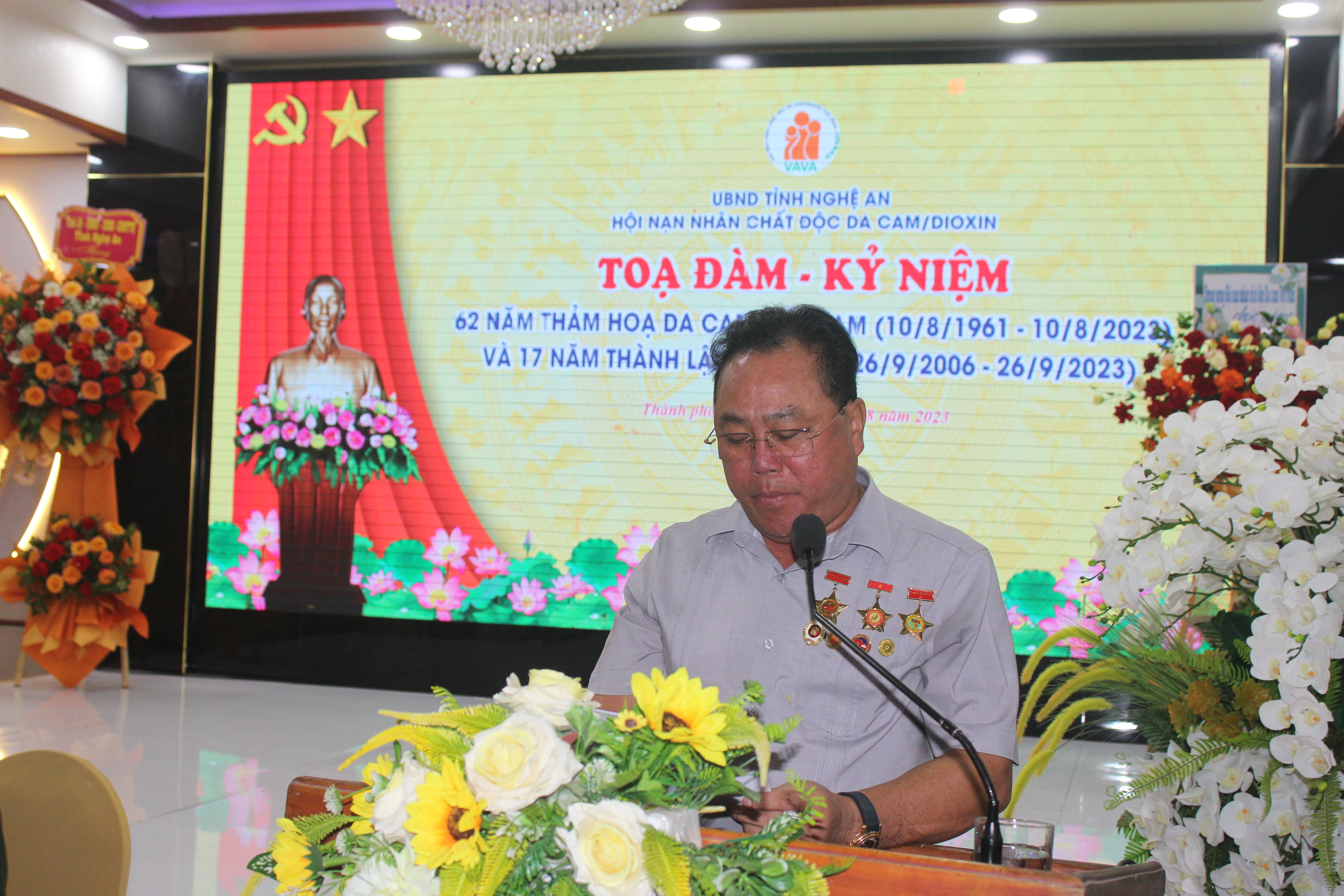 Cùng ngày, Hội NNCĐDC/dioxin tỉnh Nghệ An tổ chức buổi tọa đàm nhân kỷ niệm 62 năm “Thảm họa da cam ở Việt Nam” (10/8/1961 - 10/8/2023) với sự tham dự của ông Bùi Đình Long- Phó chủ tịch UBND tỉnh cùng đại diện các sở, ban, ngành, đoàn thể cấp tỉnh và đại diện các Huyện hội trên địa bàn tỉnh và đại diện Tạp chí Da cam Việt Nam.