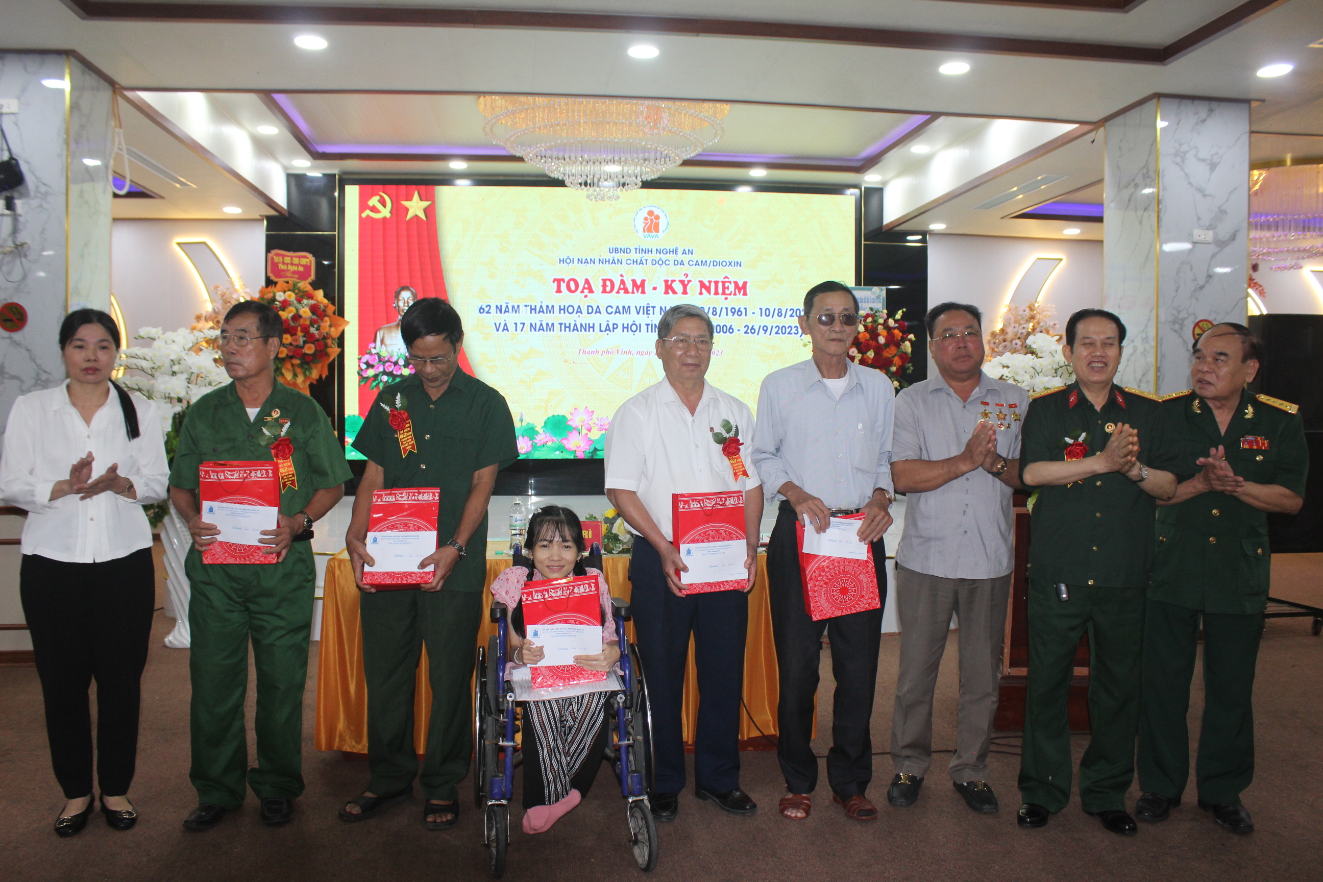 Dịp này, Hội tỉnh Nghệ An trao 5 suất quà cho 5 nạn nhân chất độc da cam tiêu biểu vươn lên trong cuộc sống; Tạp chí điện tử Da cam Việt Nam Văn phòng Bắc miền Trung trao 8 suất quà cho NNCĐDC Khối 17, phường Hưng Bình, thành phố Vinh.