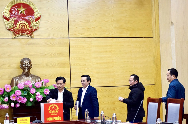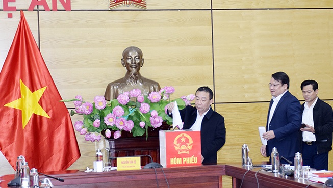 Ông Nguyễn Văn Đệ - Phó Chủ tịch UBND tỉnh Nghệ An cùng Hội Đồng thẩm định bỏ phiếu bình chon NTM
