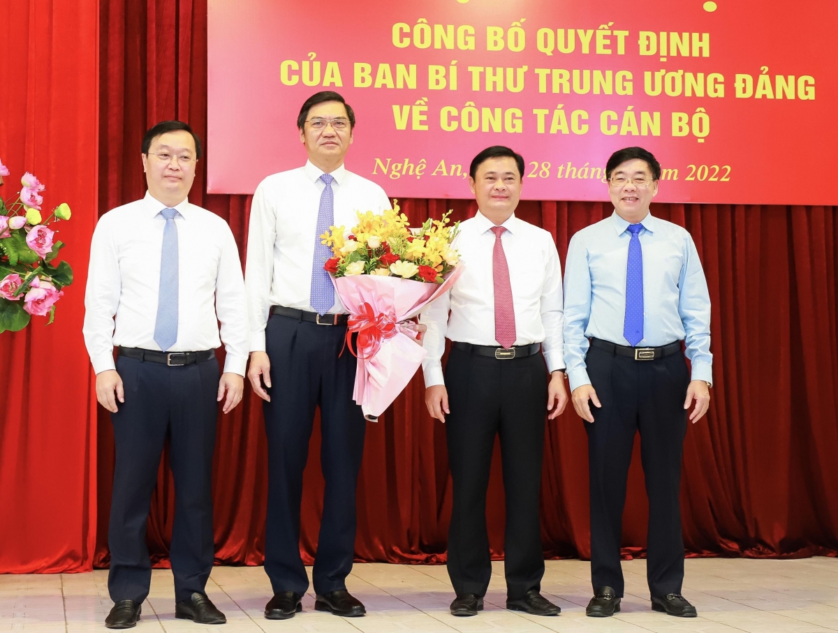 | Tập thể lãnh đạo tỉnh Nghệ An tặng hoa chúc mừng tân Phó Bí thư Tỉnh ủy Nghệ An, Hoàng Nghĩa Hiếu |