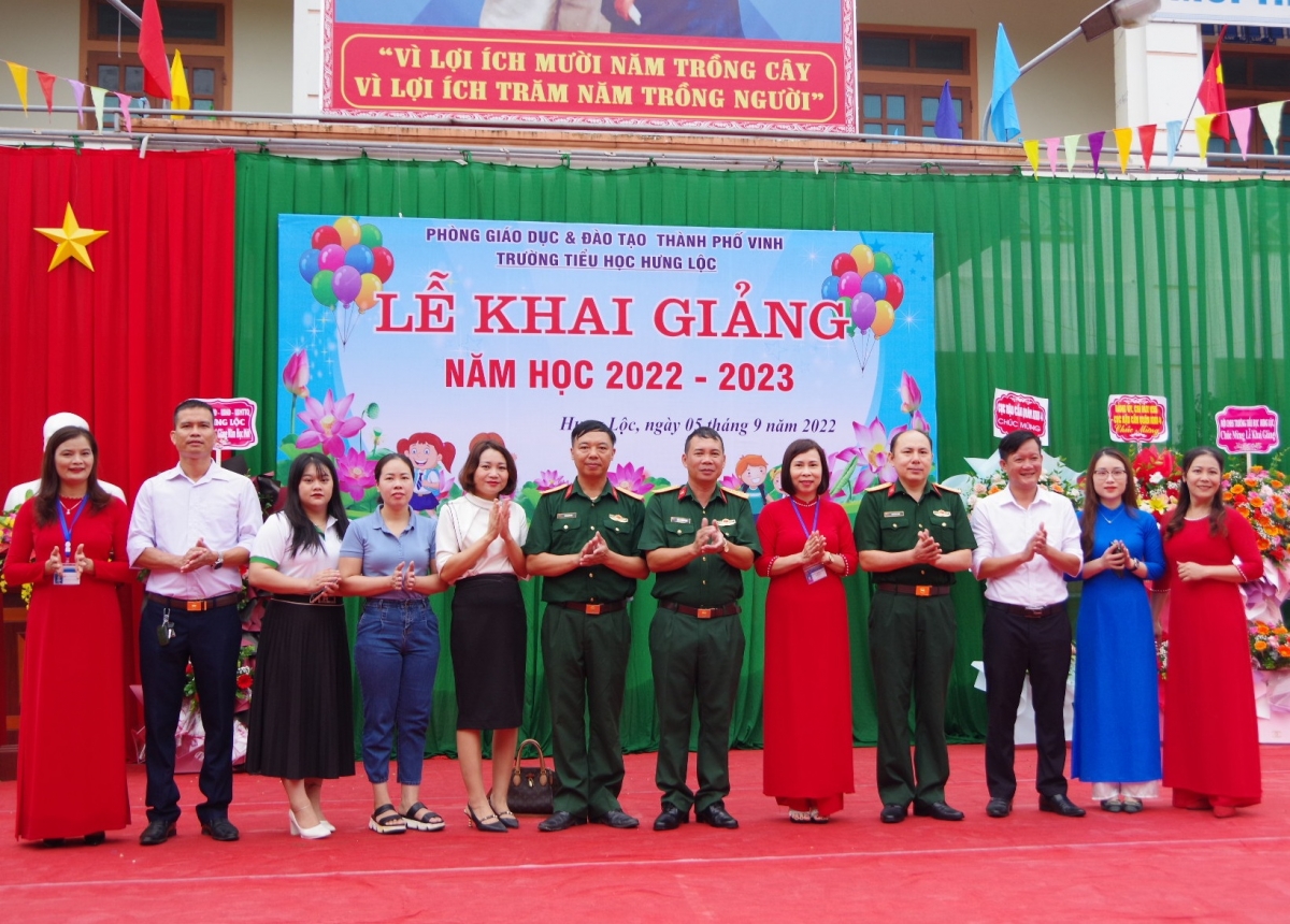 | Các đoàn thể, các đơn vị kết nghĩa trên địa bàn và lãnh đạo địa phương cùng dự Lễ khai giảng Trường Tiểu học Hưng Lộc |