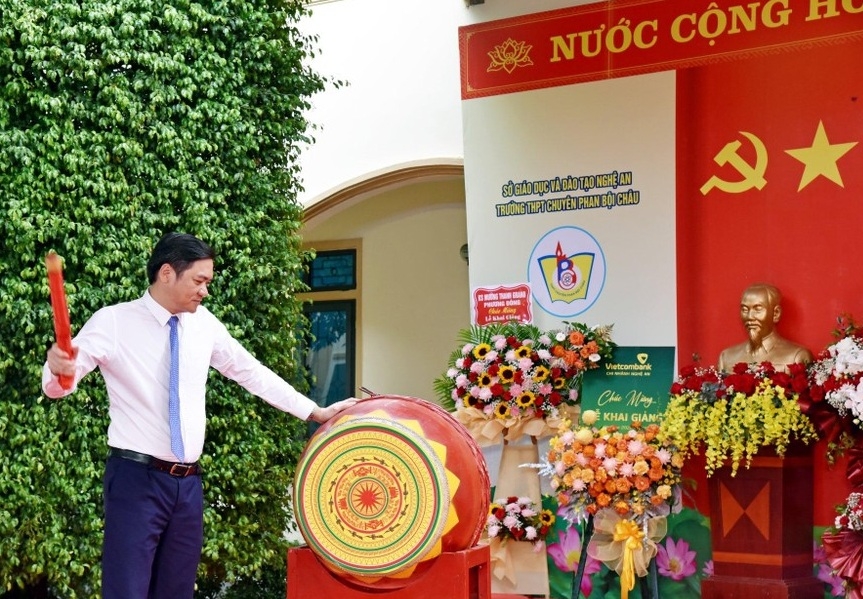 | Ông Hoàng Nghĩa Hiếu, Phó Bí thư tỉnh ủy, Phó Chủ tịch UBND tỉnh đánh trống khai trường và trao học bổng cho học sinh trường Phan Bội Châu |
