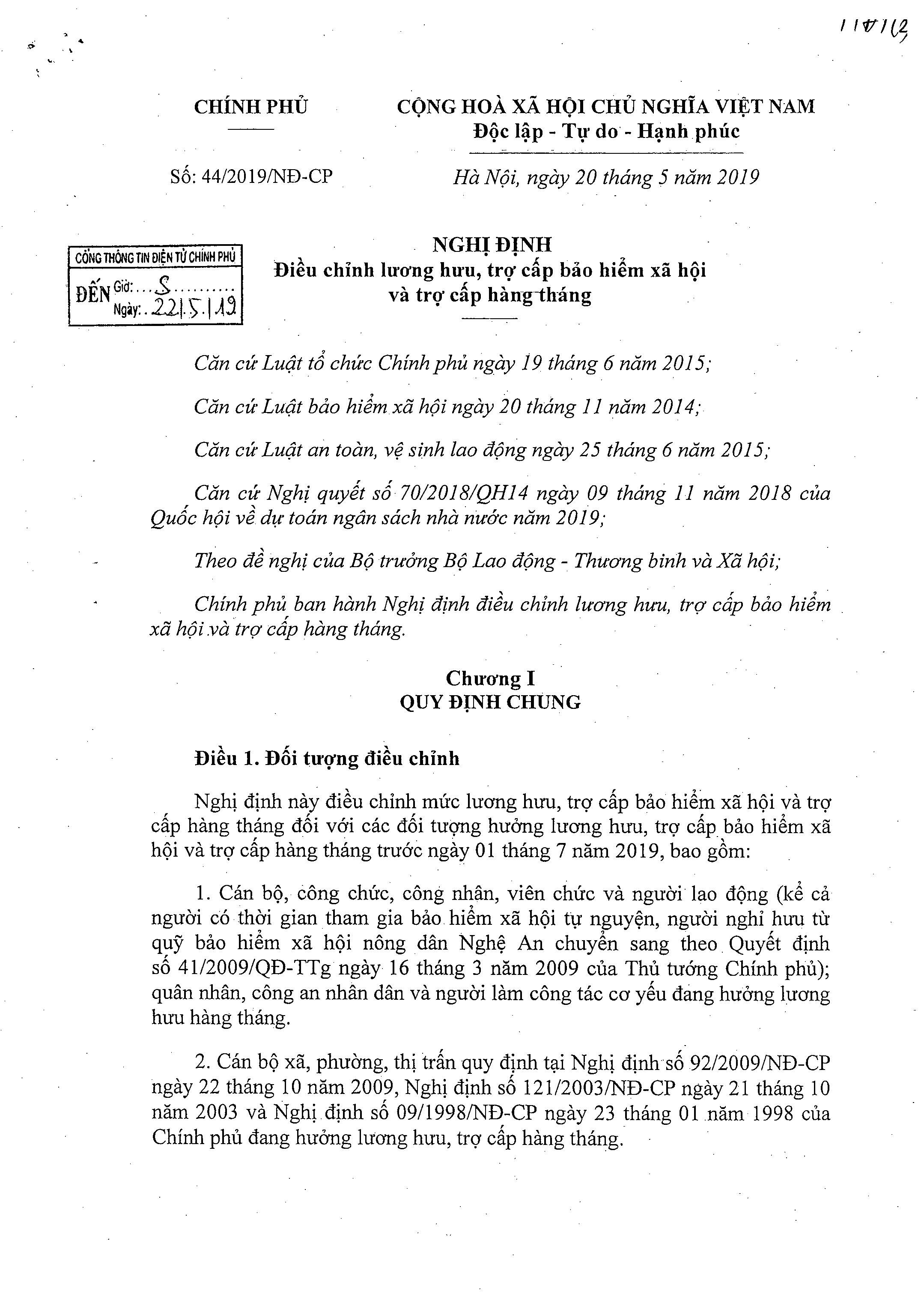Nghị định số 44/NĐ-CP ngày 20/5/2019 về điều chỉnh lương hưu, trợ cấp bảo hiểm xã hội và trợ cấp hàng tháng