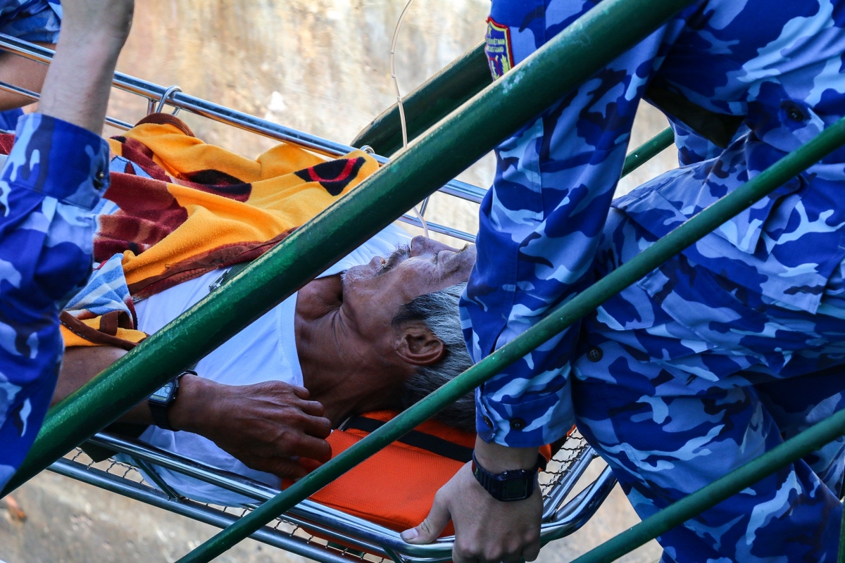 | Ngư dân Trần Thuận Thanh được đưa đi cấp cứu ngay sau khi tàu Cảnh sát biển 7011 cập bờ. Ảnh: Xuân Hoát. |
