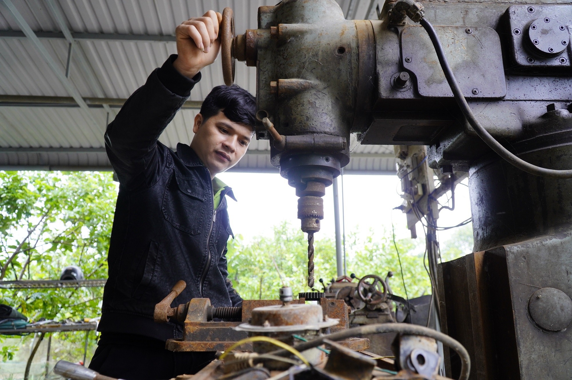 Nhà Hóa nằm trong con hẻm nhỏ trên đường liên thôn, nhìn bên ngoài dung dị như bao ngôi nhà khác ở vùng quê này. Chỉ khi vào sân mới thấy sự khác biệt, kiểu như đó là một công xưởng cơ khí với máy móc hàn, tiện, sắt thép để ngổn ngang… Hóa trẻ hơn rất nhiều so với cái tuổi 27 của mình, cái tuổi mà ở quê, có 2 đứa con là chuyện thường. Cậu trắng trẻo, mũi cao, mắt đen… bẽn lẽn không khác gì học sinh cấp 3 khi lần đầu gặp người lạ.