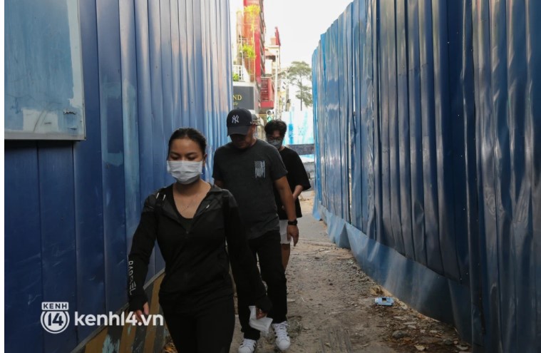 Người dân chật vật luồn lách qua lối nhỏ trước nhà mình do rào chắn công trình