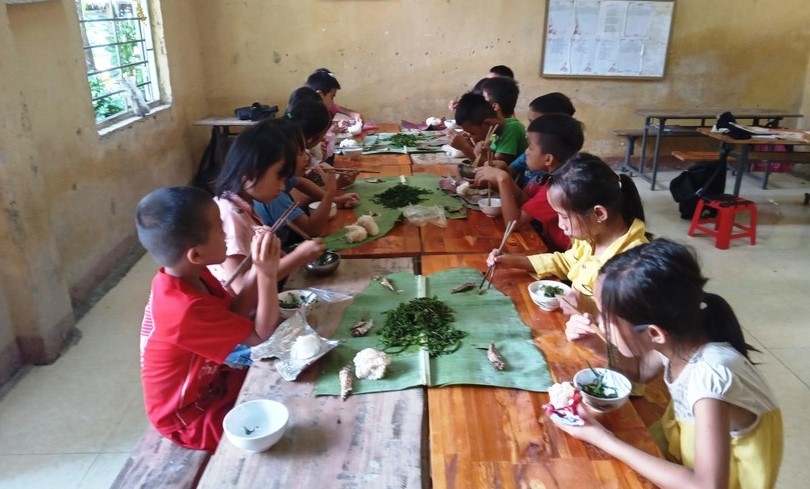 | Học sinh điểm trường bản Vui - Trường Tiểu học Thanh Xuân (Quan Hóa) mang cơm từ nhà đến lớp, còn thức ăn do thầy, cô giáo lo cho các em. |