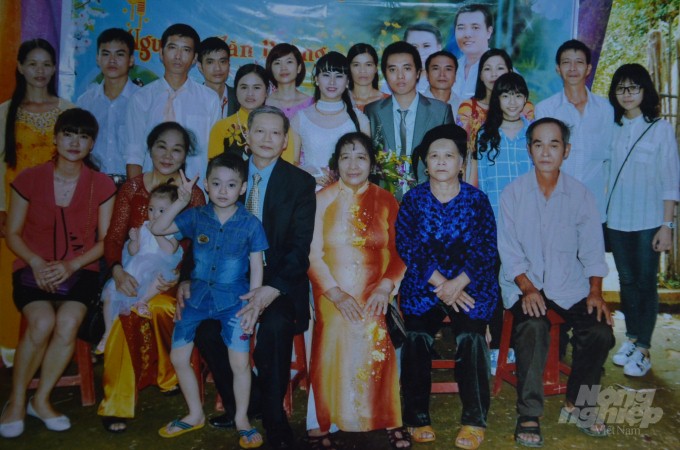 Ông Minh mặc comple ngồi hàng đầu, cạnh bà vợ mặc áo dài (bên phải) cùng họ hàng, các con cháu. Ảnh: Nhân vật cung cấp.