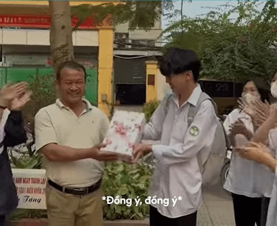 Nhận được món quà ý nghĩa của các bạn học trò, bác bảo vệ không giấu được niềm vui và sự xúc động. Món quà ấy là một chiếc áo khá đẹp mắt và vừa vặn với bác bảo vệ. Ngay sau khi nhận món quà ấy, bác bảo vệ cũng đã ướm thử lên người.