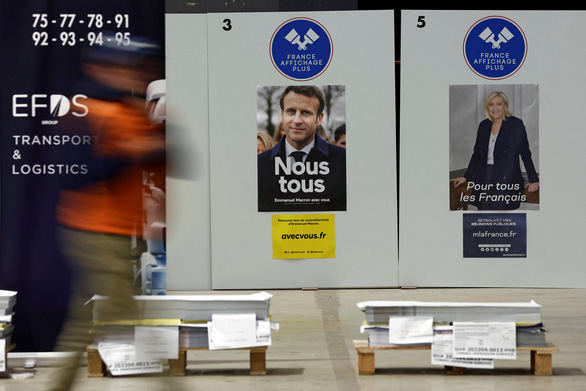 Chuẩn bị poster vận động tranh cử chính thức của hai ứng cử viên Macron và Le Pen tại Mitry-Mory, bên ngoài Paris (Pháp) vào ngày 13-4-2022 - Ảnh: Reuters