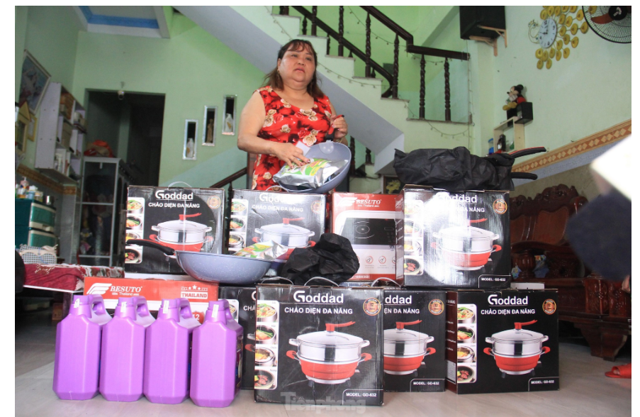 | Bà Hoài bị dụ mua hàng chục chiếc nồi, chảo, bếp từ, nước giặt...với số tiền hơn 70 triệu. |