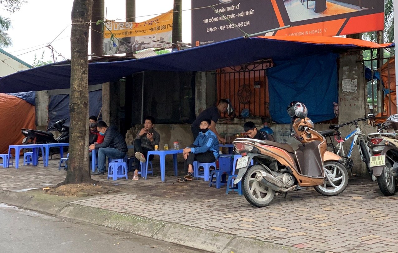 Tiếp tục ghi nhận trên phố Hoàng Trọng Mậu, đối diện dự án The Emerald, một quán trà đá "chễm chệ" chiếm toàn bộ vỉa hè. Trong quán, nhiều người ngồi xúm xít uống trà mà không ai đeo khẩu trang. Tương tự, trên vỉa hè phố Vũ Quỳnh, đoạn trước cửa toà nhà Sudeco CT1, một quán trà đá cũng ngang nhiên hoạt động, khách hàng không giữ khoảng cách 2m như quy định.