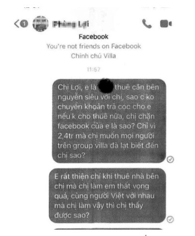Theo đơn của ông C.N.T. (Việt kiều Mỹ), ngày 23/2/2022, ông chuyển khoản 21 triệu đồng qua tài khoản của Lại Thanh Nhã để đặt thuê 1 villa ở Đà Lạt. Đến ngày 4/3/2022, ông tiếp tục chuyển 21 triệu đồng qua số tài khoản Lại Thanh Nhã để đặt thuê 1 villa trên đường Nguyễn Hữu Cảnh TP.Đà Lạt từ ngày 17 - 19/3.