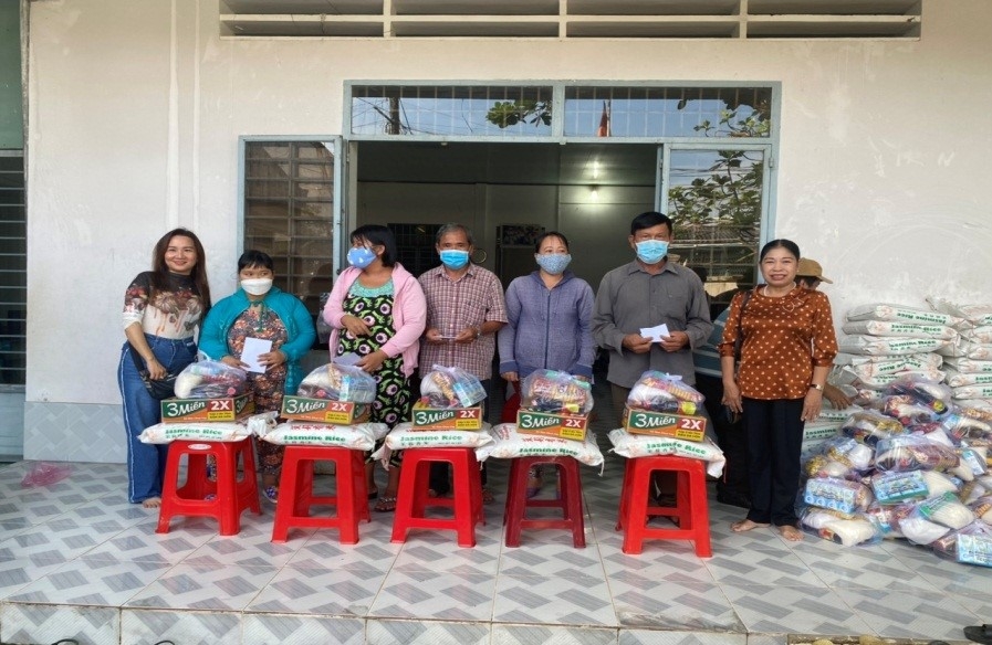 | Bà Võ Thị Thủy, Phó Chủ tịch Hội NNCĐDC/dioxin- BVQTE tỉnh Bến Tre (thứ nhất bên phải) cùng đại diện Nhóm thiện nguyện Hương Sen tặng quà cho NNCĐDC xã Phú Túc |