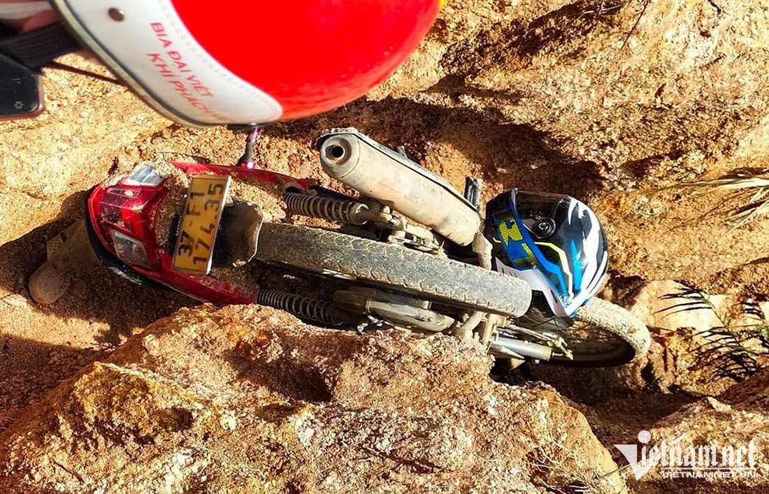 | Xe máy bám đầy bùn lầy. Các thầy thậm chí phải cùng nhau dùng cáng khiêng xe qua dốc, qua suối |