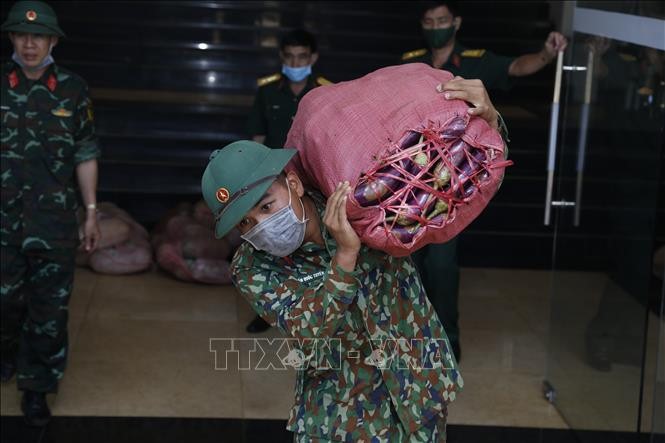 Chiến sĩ Quân đoàn 3 chuẩn bị rau củ tăng gia của các đơn vị gửi vào hỗ trợ người dân TP Hồ Chí Minh.