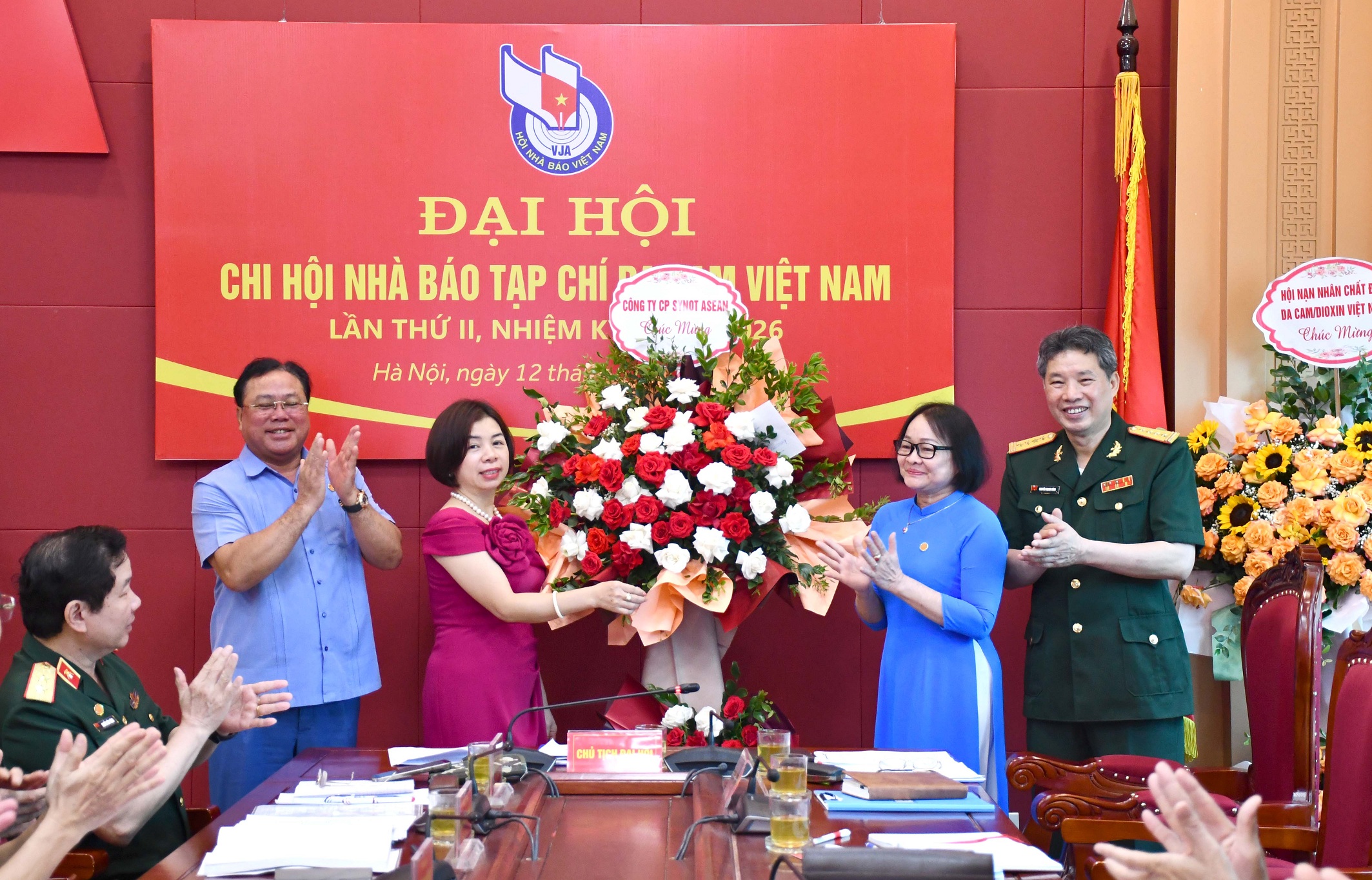 Chủ tịch Hội NNCĐDC/dioxin Việt Nam, Trung tướng Nguyễn Hữu Chính (thứ 3 bên trái) tặng hoa chúc mừng Đại hội Chi hội Hội Nhà báo Tạp chí Da cam Việt Nam