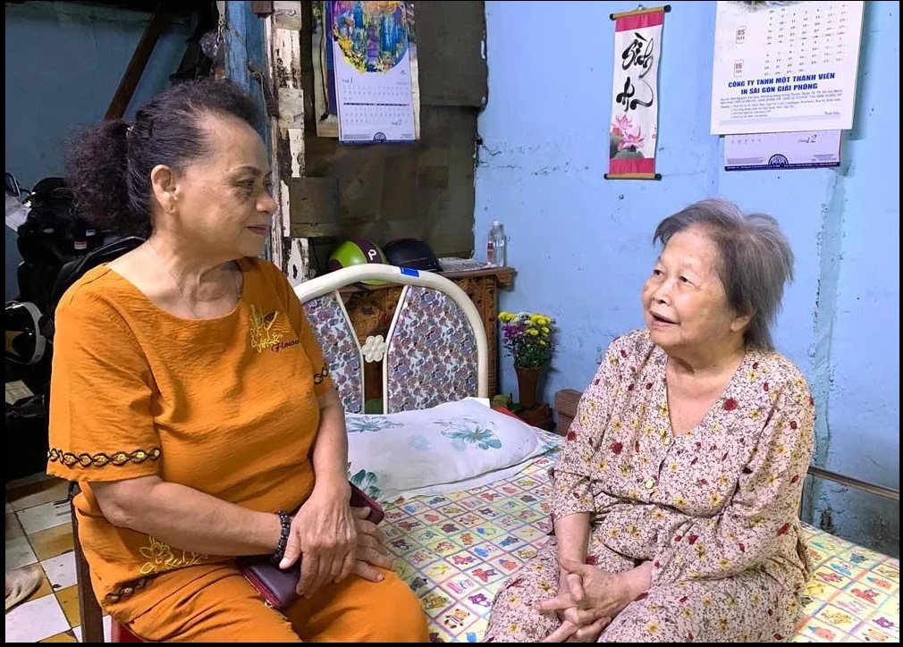 | Bà Nguyễn Thị Hường, Phó Chủ nhiệm CLB Hội mẹ truyền thống quận 1 (trái), thăm hỏi sức khỏe một hộ nghèo tại phường Đa Kao. Ảnh: THÁI PHƯƠNG |