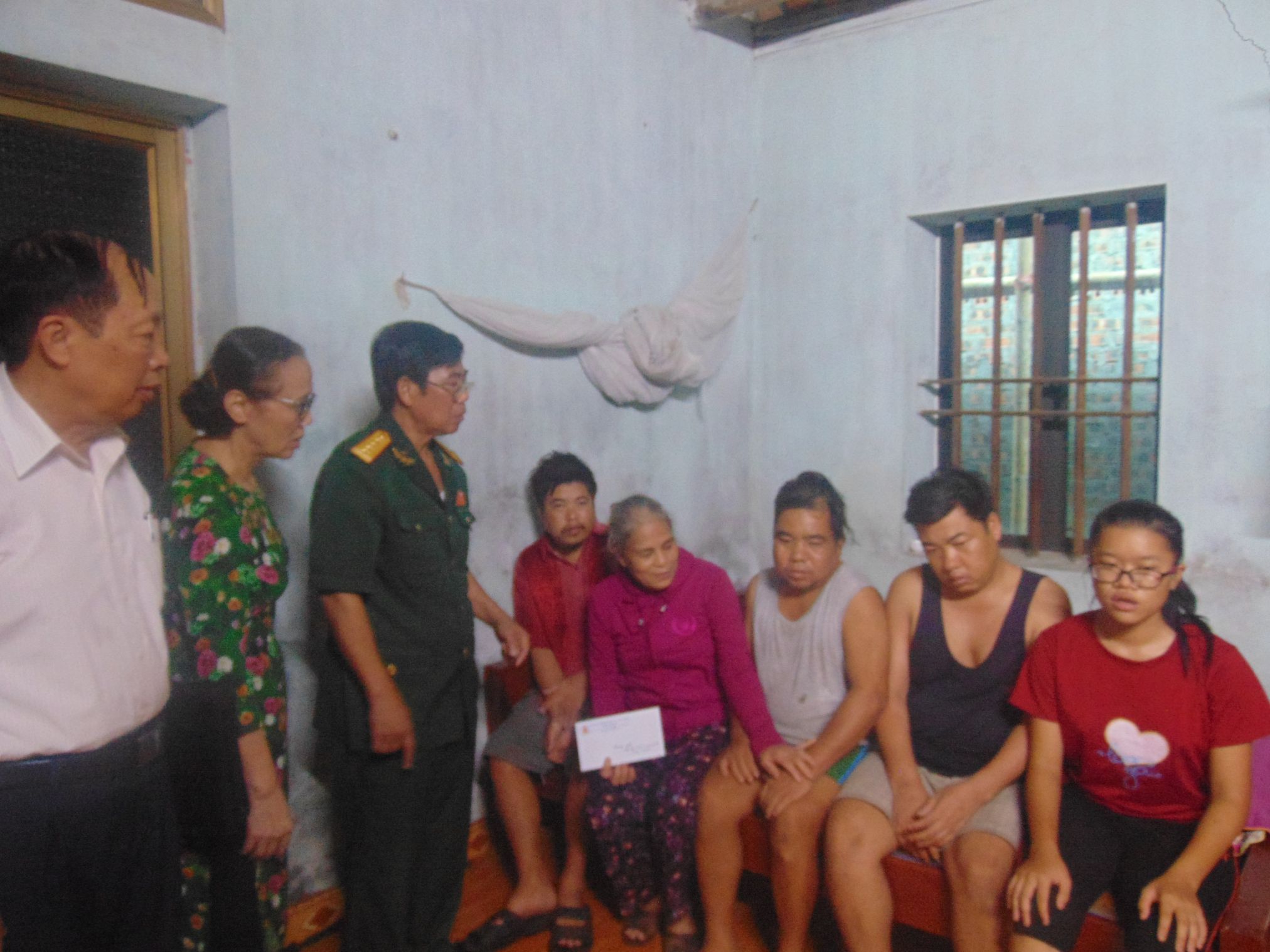 Đồng chí Tạ Quang Chính (người mặc quân phục), Ủy viên BCH Trung ương Hội, Chủ tịch Hội NNCĐDC/dioxin tỉnh tặng quà cho nạn nhân
