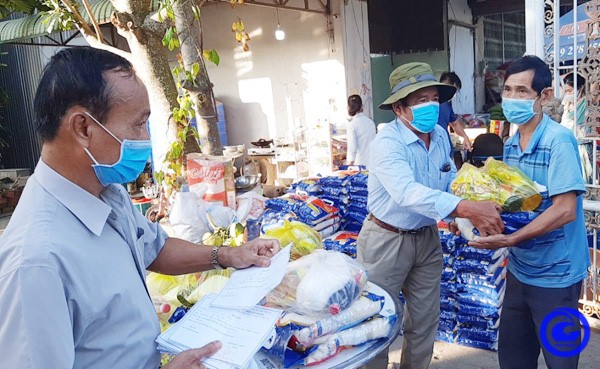 Ông Nguyễn Văn Kiều, Chủ DNTN kinh doanh gạo tại ấp Tây Hòa trao quà Tết Nhâm Dần cho nạn nhân trong xã. |