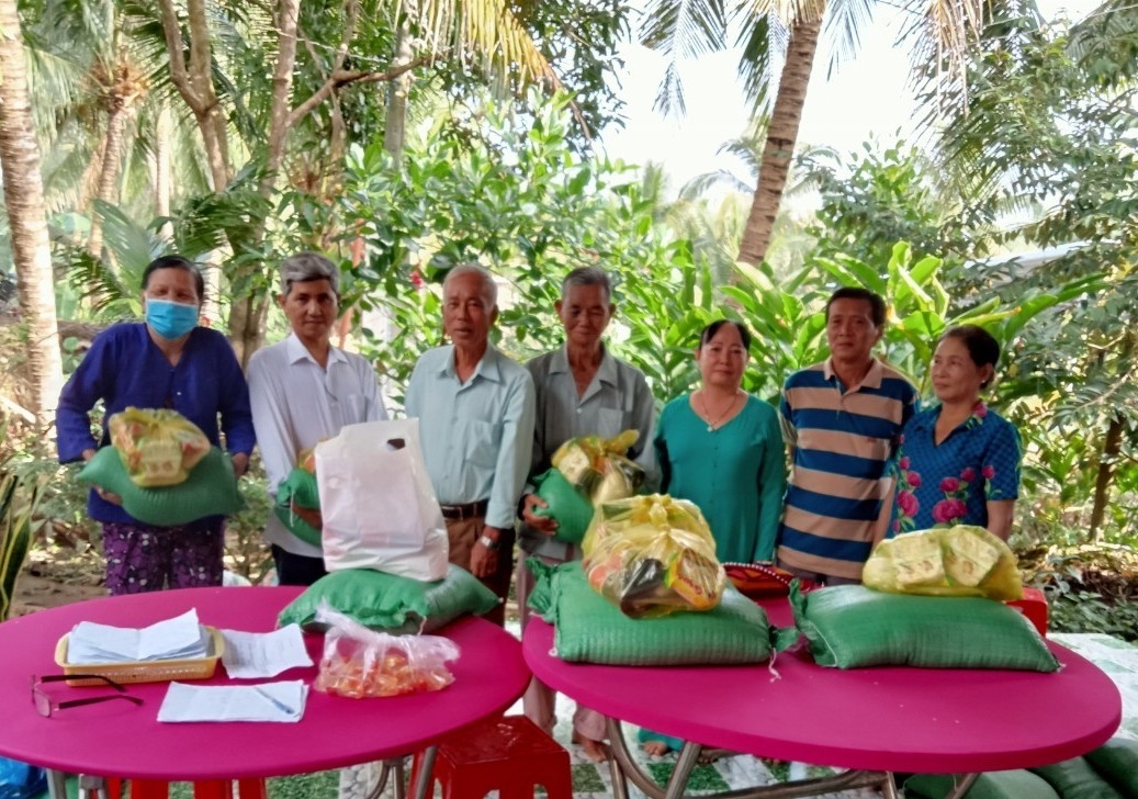 | Ông Trần Thanh Nhờ, Chủ tịch Hội xã Mỹ Long trao quà Tết cho nạn nhân trong xã. |