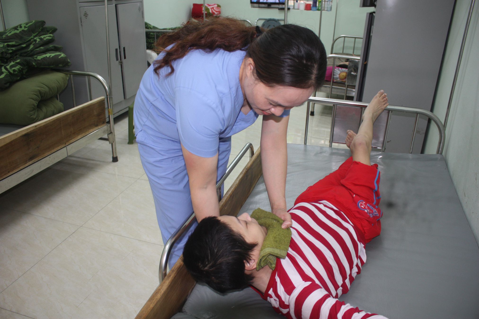 Anh Nguyễn Văn Thuấn, nhân viên chăm sóc đã gắn bó với Trung tâm hơn 10 năm, anh rất khiêm tốn khi nói về công việc của mình, nhưng không chỉ cán bộ, nhân viên của Trung tâm mà cả gia đình nạn nhân đều cảm phục, trân trọng tấm lòng của anh dành cho nạn nhân. Anh Thuấn cho biết: Trung tâm có hơn 90 đối tượng là NNCĐDC, mỗi người mỗi bệnh, mỗi tính, rất khó chiều, mùa hè, một ngày 3 - 4 lần tắm, thay quần áo cho nạn nhân, mùa đông thì một đêm phải 4 - 5 lần đi kiểm tra các phòng, đắp lại chăn cho từng người, nhất là đối tượng bị liệt, khi chăn bị đạp ra góc giường thì không thể tự đắp lại được, nhiều lần nhìn thấy nạn nhân bị rét run mà không cầm được nước mắt, quần áo một ngày không biết bao nhiêu lần thay. Vừa thay xong, lên cơn động kinh là xé, cởi bỏ hết, ném lung tung khắp nhà, anh lại phải lựa lời, nhẹ nhàng khuyên nhủ từng người như dỗ trẻ nhỏ. Nhiều lần anh đã bị nạn nhân tâm thần cầm gạch đuổi đánh chạy khắp sân, có lần cắn, cào cấu xước da, rách thịt, đau điếng người nhưng không thể cáu gắt, quát tháo, đánh lại nạn nhân mà phải dịu dàng như dỗ trẻ nhỏ. Anh Thuấn chia sẻ: nhiều khi nhìn nạn nhân vui đùa với nhau, mình cũng thấy vui lây, sợ nhất là số nạn nhân tâm thần nặng, lúc lên cơn cứ sùi bọt mép, chân tay co quắp, người run bần bật, lúc đó anh em phải khống chế không cho nạn nhân va chạm vào vật nhọn, vật cứng mà phải cho nạn nhân nằm im, nghiêng đầu sang một bên để nạn nhân không cắn vào lưỡi, không để lưỡi tụt vào đè đường thở, như trường hợp Phạm Lan Phương (SN 1987, quê Từ Liêm, Hà Nội), khi động kinh, nhân viên cho uống thuốc thì nằm im, ngủ, nhưng chỉ 30 - 40 phút sau lại lên cơn, vùng vằng, quậy phá, gặp ai là đánh. Trường hợp này chị em phải thay nhau túc trực bên nạn nhân suốt ngày đêm. Nhiều trường hợp nạn nhân bị ốm hay mới dứt cơn động kinh, anh em phải trải chiếu ngoài hiên ngủ canh nạn nhân, nếu sơ xuất là nạn nhân trong phòng đánh lẫn nhau, đập phá giường, xé chăn màn. Anh Thuấn tâm sự: hoàn cảnh gia đình anh cũng khó khan, hiện tại, ở nhà mẹ anh đang chăm sóc 3 NNCĐDC là bố và hai người em gái. Vì vậy, anh thấu hiểu nỗi đau của NNCĐDC, ở Trung tâm anh chăm sóc các nạn nhân như chăm sóc người em của mình ở quê. Không nề hà bất cứ một công việc gì từ đổ bô vệ sinh đến tắm, rửa cho nạn nhân, lau dọn phòng ngủ, giặt chăn chiếu khi nạn nhân vấy bẩn. Anh Phùng Trần Luân, Phó phòng Nuôi dưỡng, chăm sóc cho biết: chăm sóc bệnh nhân nam bị đuổi đánh, cào cấu như anh Thuấn hãy còn dễ chịu đựng, đối với bệnh nhân nữ, bệnh nhân liệt toàn thân thì vất vả gấp nhiều lần, nhân viên phục vụ phải thật sự tận tâm, hết lòng vì nạn nhân mới làm được. Chị Đào Thị Thủy (SN 1975), là người có mặt ở Trung tâm lâu nhất, đã gần 20 năm, chị hiểu tính tình, bệnh tật, sở thích của từng nạn nhân, chị Thủy thật lòng, nói: Ở Trung tâm, hàng ngày mình chăm sóc nạn nhân còn nhiều hơn, chu đáo hơn chăm sóc bố, mẹ, chồng con ở nhà, chị kể: buổi sang, lên vệ sinh phòng ngủ nạn nhân, nếu không quen, không thể bước nổi vào phòng, đêm, mặc dù trước khi đi ngủ đã đóng bỉm, nhưng nạn nhân vẫn “đi nặng, đi nhẹ” bê bết đầy giường, mình lại dọn dẹp, tắm rửa cho nạn nhân; có những nạn nhân một ngày đi vệ sinh 4 - 5 lần, mỗi lần như vậy, chị lại phải nâng đỡ nạn nhân ngồi dậy hoặc bế nạn nhân ngồi vào bô, nhiều lần chị Thủy đã bị nạn nhân ném phân vào người, đến bữa không nuốt nổi cơm. Sau này chị đã luyện cho nạn nhân biết ra ký hiệu mỗi khi cần đi vệ sinh, như: đi nặng thì vỗ vào mông, đi nhẹ thì chỉ tay vào bô, khát nước thì chỉ ngón tay vào miệng, những ký hiệu như vậy chỉ có nhân viên mới hiểu được. Chị Thủy cho biết them: đối với bệnh nhân nữ, nhân viên còn phải làm một việc mà nhân viên nam không thể làm thay, đó là phải lập sổ theo rõi chu kỳ “phữ nữ” hàng tháng, của từng người để giúp nạn nhân vệ sinh. Đối với nạn nhân bị liệt, tâm thần nặng thì chị em phải làm tất cả. Chị Thủy nói vui: ở nhà con khóc, chưa chắc mình hát hay mở điện thoại dỗ nó, ở đây thì thường xuyên, thậm chí phải ngồi bên cạnh vỗ về, xoa lưng, mở điện thoại để bên tai nạn nhân để dỗ ngủ. Theo chị Thủy, vất vả nhất là khi nạn nhân câm, điếc bị ốm, họ không biết kêu mà chỉ ú ớ, quằn quại, nước mắt chảy giàn dụa trên mặt, chị em y tế cũng khóc theo. Thương lắm, những trường hợp bệnh nặng, Trung tâm phải đưa đi Bệnh viện Quân y 105, Bệnh viện Đa khoa huyện Ba Vì, anh chị em lại phân công nhau đi chăm sóc, ở viện, nhân viên phải làm tất cả mọi việc, từ cho nạn nhân vệ sinh, tắm rửa, thay quần áo, ăn uống, có lần đang ăn, nạn nhân lên cơn động kinh hắt cả bát nước canh vào người chị em. Phó phòng Ch