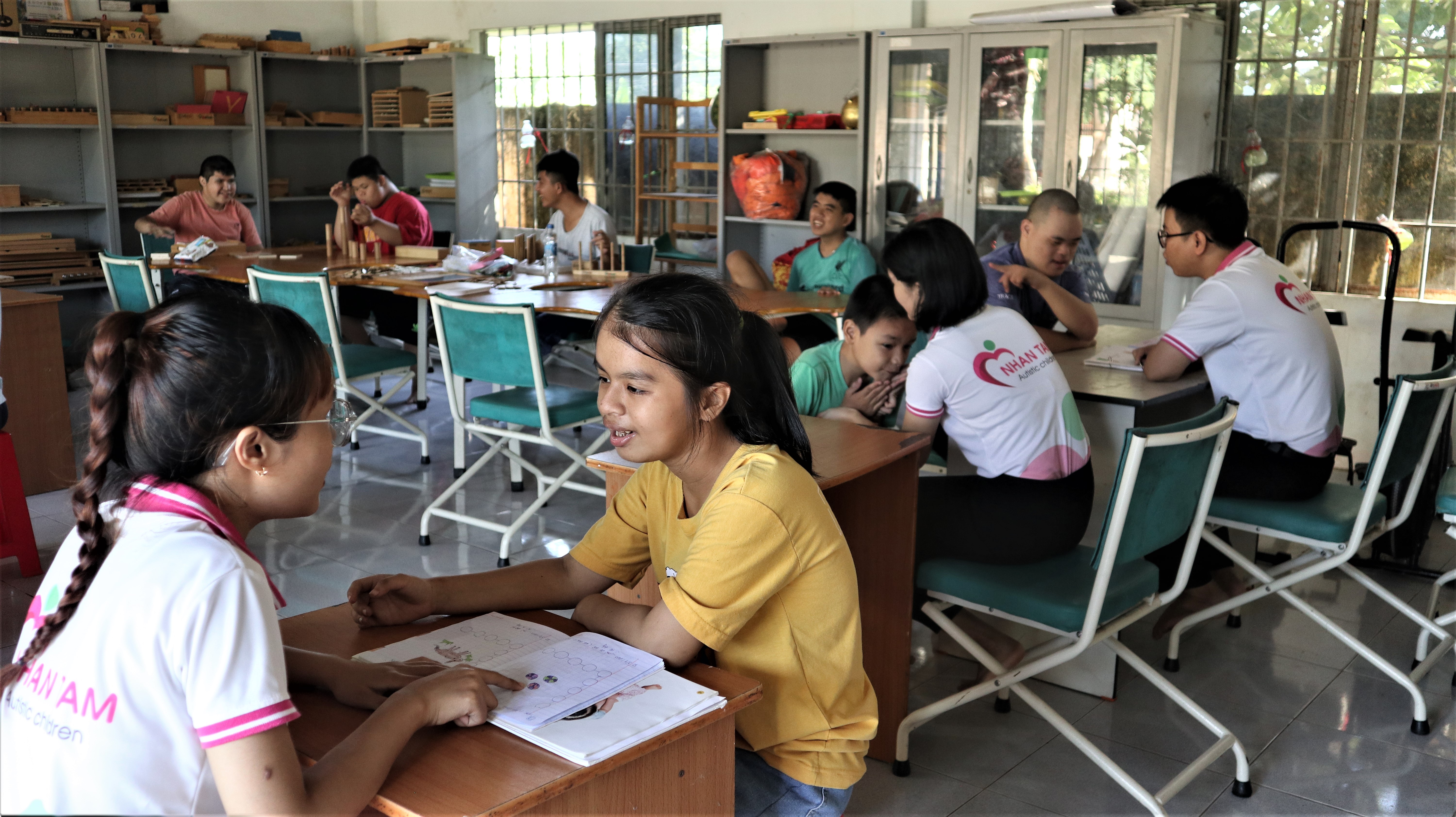 Cô giáo Nguyễn Kim Nhơn, giáo viên dạy âm ngữ trị liệu bộc bạch: “Những đứa trẻ được nuôi dạy ở đây đều khá lớn, có em sinh năm 1991, hầu hết các cháu ở đây đều bị thiểu năng trí tuệ, down, tự kỷ, một số khuyết tật vận động, liệt chi dưới, co rút cơ…. Mới đầu dạy, nhiều em chưa chịu hợp tác vì vậy chúng tôi phải vui vẻ, thân thiện, không tỏ ra nóng giận khi các em không hợp tác và khen ngợi, nhiều khi thưởng kẹo và dần dần các em đã vui vẻ hợp tác.