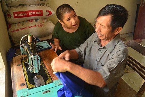 Vá quần áo cho con là công việc thường ngày của ông Xoay.