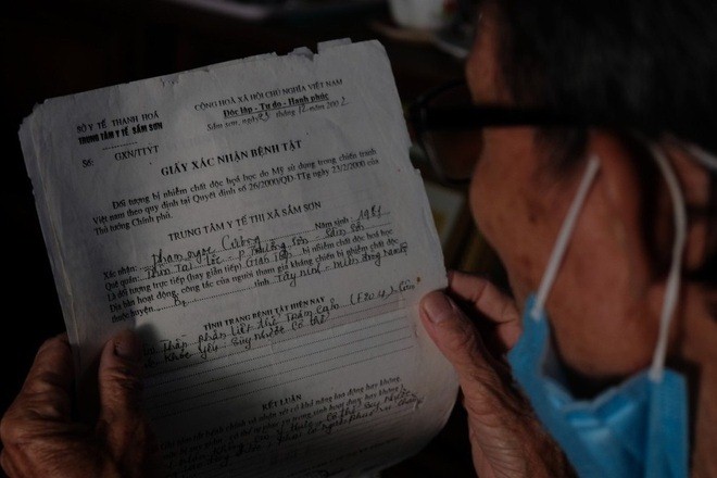 Ông Ưng run run tìm lại tờ giấy xác nhận bệnh tật của con trai út cách đây ngót 20 năm.