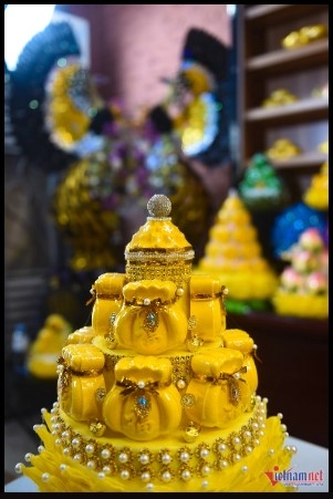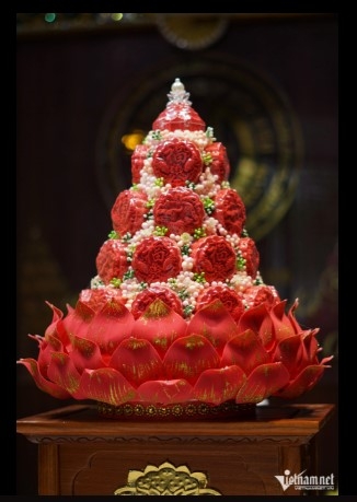Mâm oản mô phỏng tháp Báo Thiên cao 50cm, rộng 45cm, trọng lượng 4kg, giá thành 2,2 triệu đồng, thành phần chủ yếu gồm đường và bột tinh luyện. Sản phẩm này phù hợp để dâng lên tổ tiên và cầu nguyện những điều thiêng liêng và tốt đẹp.