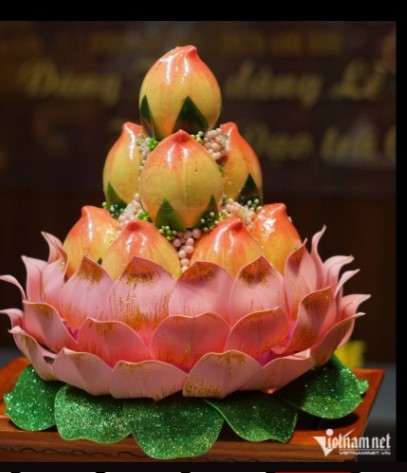 Mâm oản trái đào kích thước bán kính 36cm, nặng 3kg, giá thành 1,4 triệu đồng, được lấy ý tưởng từ quả đào tiên, mang ý nghĩa trường tồn, trường thọ.