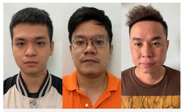 | Các đối tượng Duy, Nam, Linh tại cơ quan công an (theo thứ tự từ trái qua phải). |