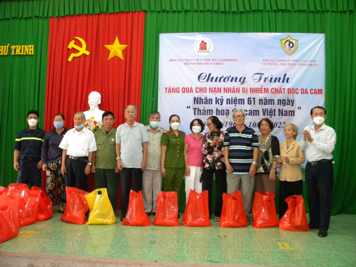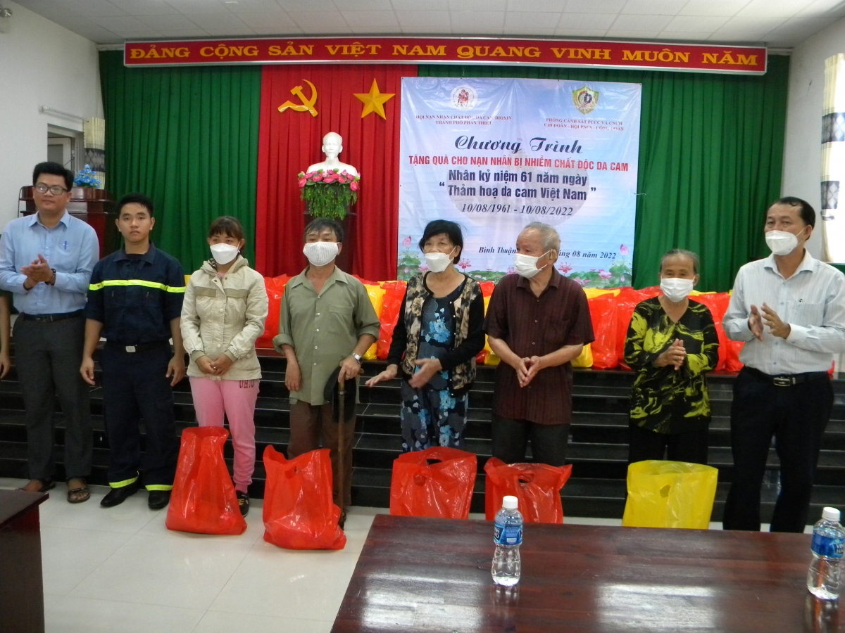 Nhân kỷ niệm 61 năm “Thảm họa da cam ở Việt Nam” (10.8.1961- 10.8.2022); trong 2 ngày 09 và 10.8.2022, Hội NNCĐDC/dioxin thành phố Phan Thiết, tỉnh Bình Thuận phối hợp với Chi đoàn TNCS HCM, Hội Phụ nữ cảnh sát, Công đoàn trực thuộc Phòng Cảnh sát PCCC& CHCN Công an tỉnh Bình Thuận, tổ chức chương trình đi thăm, tặng quà cho gần 250 người bị nhiễm chất độc da cam/dioxin, thường trú trên địa bàn thành phố Phan Thiết. Mỗi nạn nhân được trao tặng một phần quà gồm: gạo, nước mắm, dầu ăn, trị giá gần 300.000đồng, nguồn do Hội NNCĐDC.dioxin thành phố Phan Thiết vận động từ các mạnh thường quân đứng chân trên địa bàn thành phố Phan Thiết và TP HCM ủng hộ.