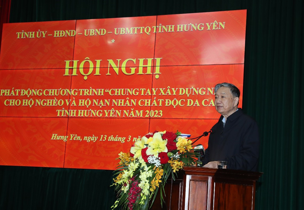 Phát biểu tại hội nghị, Đại tướng Tô Lâm, Ủy viên Bộ Chính trị, Bộ trưởng Bộ Công an nhấn mạnh: Trong mọi thời kỳ phát triển của đất nước, Đảng, Nhà nước ta đều đặc biệt quan tâm đến việc xóa đói, giảm nghèo, bảo đảm ASXH. Tiếp tục phát huy truyền thống “Lá lành đùm lá rách”, cấp ủy, chính quyền, MTTQ Việt Nam các cấp tỉnh Hưng Yên đẩy mạnh tuyên truyền, vận động để các doanh nghiệp, doanh nhân, nhà hảo tâm, các tầng lớp Nhân dân tích cực tham gia hoạt động có ý nghĩa nhân văn, thể hiện sâu sắc tình dân tộc, nghĩa đồng bào. Tỉnh chỉ đạo rà soát chặt chẽ, hỗ trợ đúng đối tượng để số tiền hỗ trợ của doanh nghiệp, nhà hảo tâm và Nhân dân phát huy hiệu quả cao nhất.